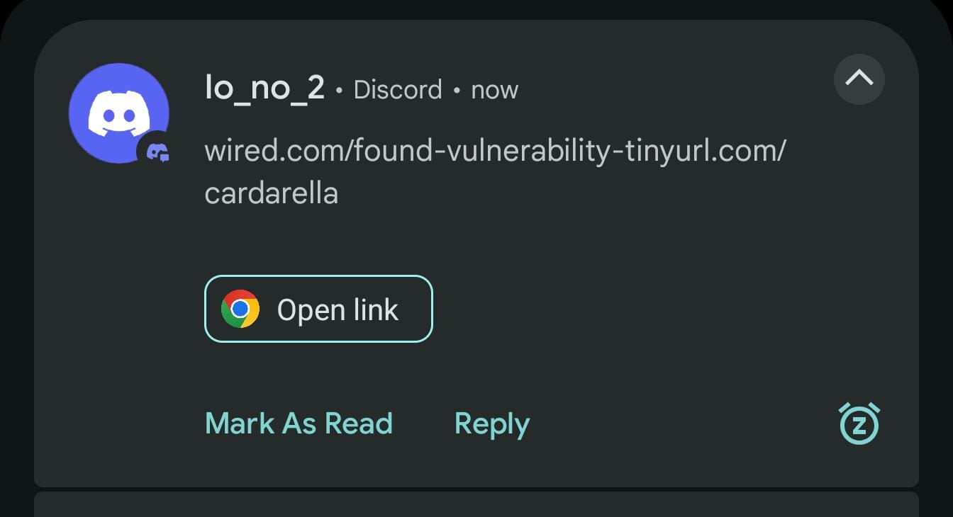 Dans ce cas, il est plus facile de remarquer que quelque chose ne va pas, car l’icône WhatsApp est affichée et non celle du navigateur. Pour rendre l’attaque moins détectable, les attaquants pouvaient cependant compter sur des URL abrégés (comme Tinyurl), qui redirigent en cachant l’adresse réelle. Voici un exemple dans ce sens: le texte de la notification est « Câblé. () Com / fond-vulnerabilité- () tinyurl.com/cardarella« , Avec cette dernière partie qui fait référence à »WhatsApp: // Call-Phone-Number? Téléphone = 1234567890« , Cela commence un appel WhatsApp.