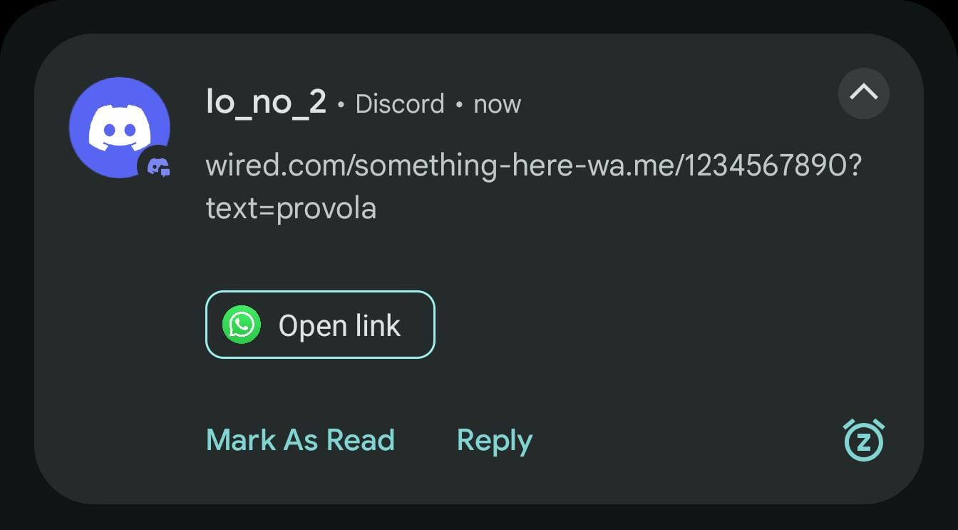 Le texte réel est « Câblé. () Com / quelque chose-here- () w.me/1234567890?text=provola« , Et le système considère à la place »W.me/1234567890?text=prove« , Par conséquent commencer WhatsApp avec un message pré-rempli. nécessitent une confirmation de l’utilisateur avec le lien profond (y compris WhatsApp, Telegram, Instagram, Discord et Slack).
