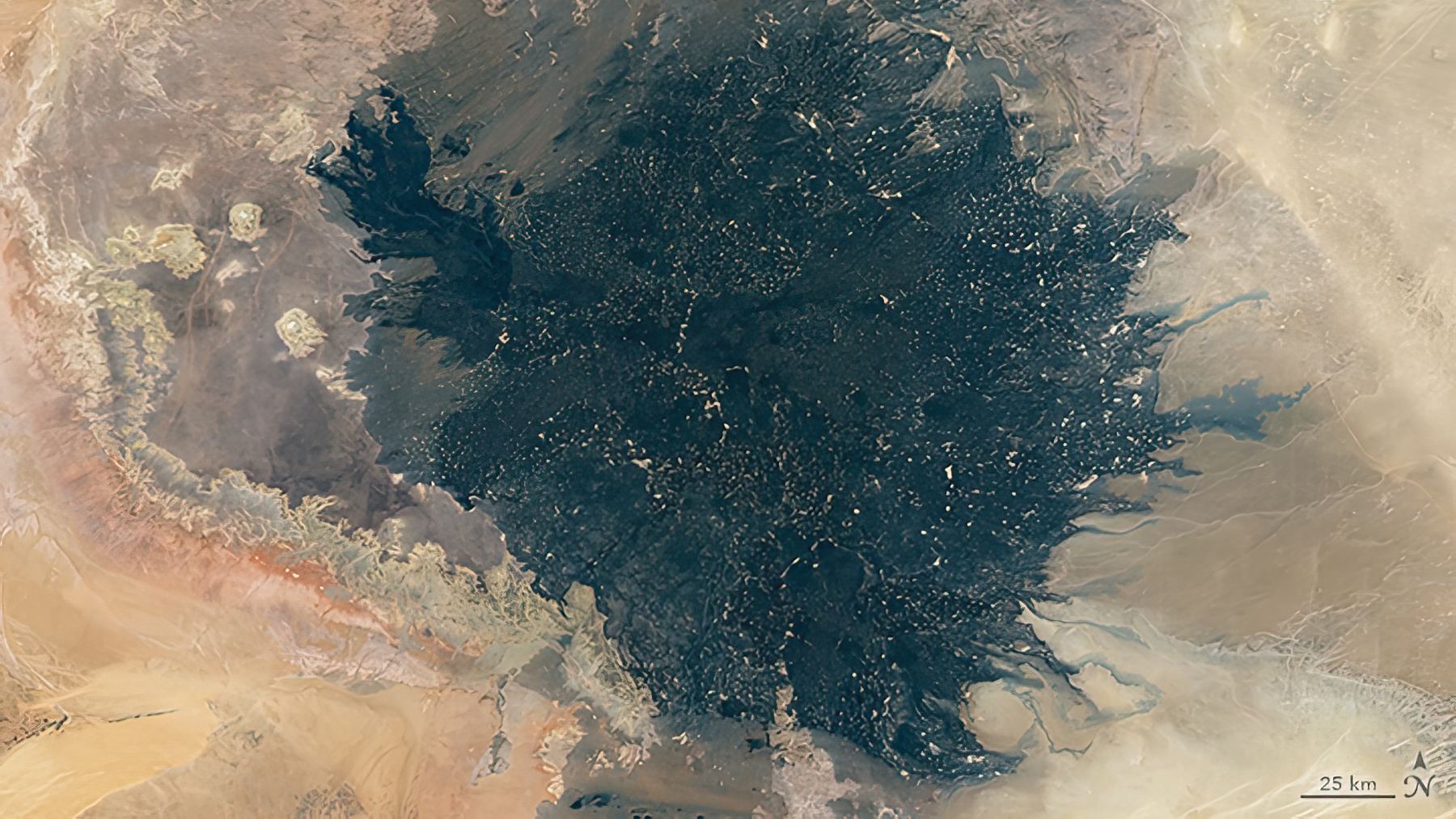 Ce qui rend Haruj particulièrement intéressant est son aspect surprenant depuis l’espace. Il ne s’agit pas d’une erreur de caméra ni d’une ombre, mais bien d’un véritable champ volcanique si vaste et si étrange qu’il semble artificiel. Les scientifiques ont confirmé que cette région abrite plus de 150 volcans éteints, accompagnés d’impressionnantes coulées de lave basaltique refroidies en pierre noire.