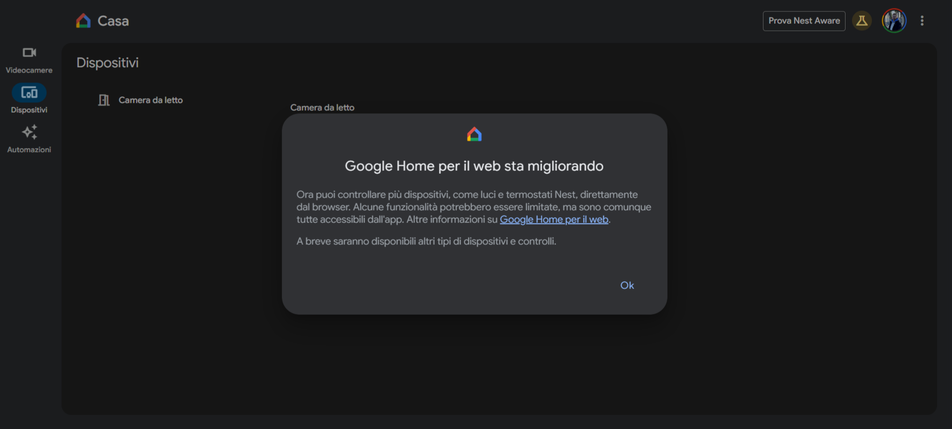 À l’ouverture de l’application, une boîte de dialogue apparaît dans laquelle il est dit que « Google Home for the Web s’améliore » et qu’à l’heure actuelle, certaines fonctions peuvent être limitées. Cependant, Google promet que de nouveaux contrôles et une compatibilité approfondie arriveront bientôt, un signe que l’entreprise travaille activement pour faire la version Web de l’application à la hauteur de celle que nous trouvons déjà sur les smartphones et les tablettes.