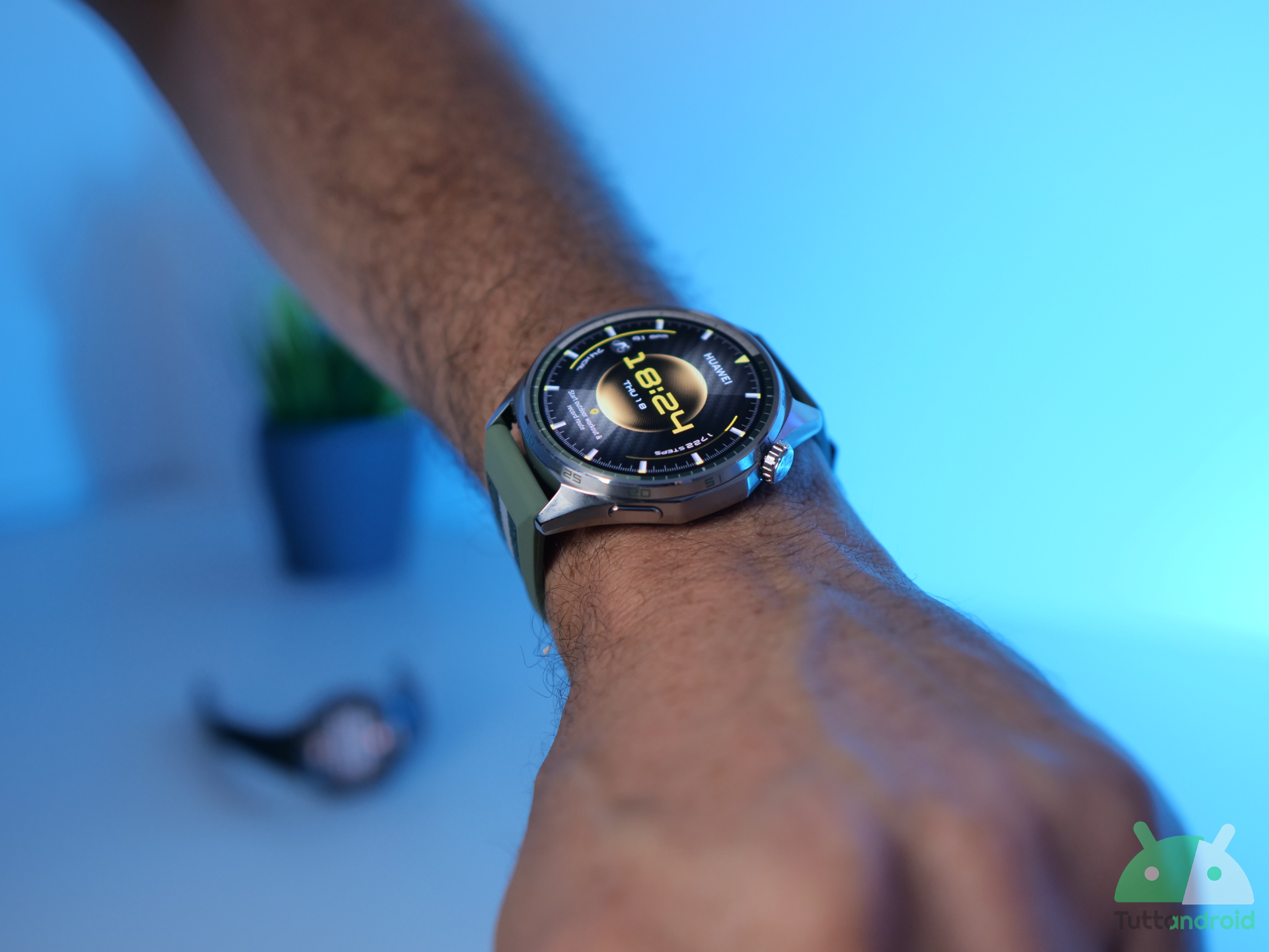 La principale différence entre Huawei Watch GT 6 Pro et Watch GT 6 concerne le matériel et la conception. Sur le modèle Pro, nous trouvons une large utilisation de solutions premium: le boîtier est en titane de qualité aérospatiale, le verre de protection est en cristal saphir et la surface qui abrite les capteurs, en contact avec le poignet, est en nanocristaux céramiques. Watch GT 6 adopte à la place un boîtier en acier inoxydable, un dos dans un matériau composite et un verre de protection standard.