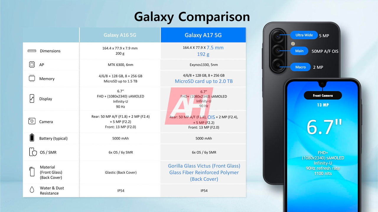 À l’avant, nous trouverons probablement un écran super amoled diagonal de 6,7 pouces avec une fréquence de mise à jour de 90 Hz, protégé à l’extérieur par un verre de verre de gorille. Malgré les rumeurs, cependant, il semble que Samsung Galaxy A17 continuera à utiliser la puce Exynos 1330 vue précédemment, combinée avec 4, 6 ou 8 Go de RAM, avec 128 ou 256 Go de mémoire interne.