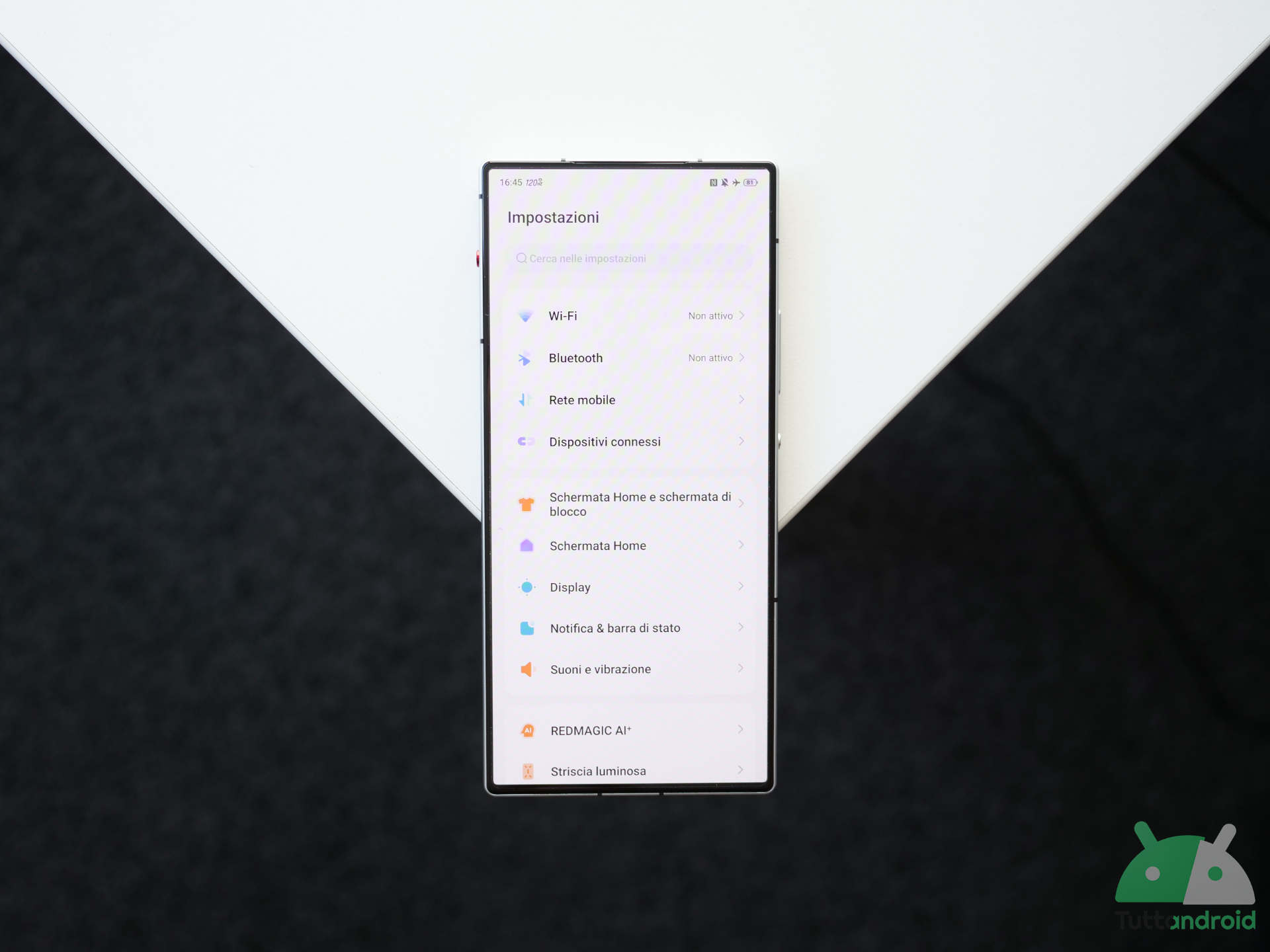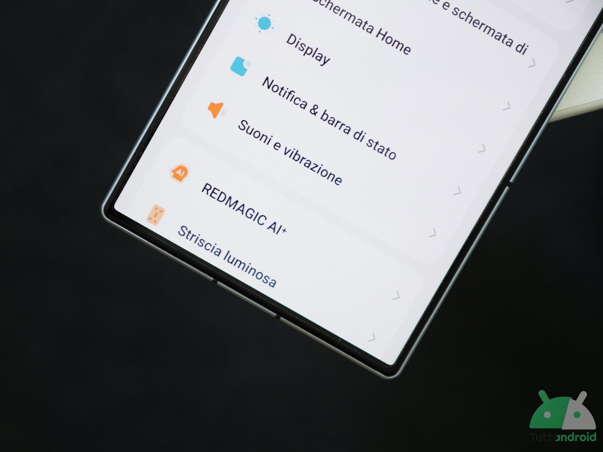 Redmagic 10 Air monte un Affichage AMOLED de 6,8 pouces au format 20: 9, avec une résolution ~ 1,5k (2480 x 1116 pixels) et une fréquence de mise à jour 120 Hz, mais surtout, c’est un écran sans interruption car la caméra selfie est cachée sous elle. Il s’agit essentiellement du même panneau que nous avons vu sur Redmagic 9 Pro. Cela signifie que par rapport au modèle 10 Pro, il n’est que légèrement moins motivé: au lieu que les 144 Hz s’arrêtent à plus de 120 Hz, ainsi qu’une luminosité maximale de 1600 nits, mais parfaite pour jouer ou voir des vidéos même à l’extérieur. Les couleurs semblent vives et saturées, mais pour ceux qui préfèrent un rendement plus naturel, il y a la « couleur » colorée ou le profil standard. L’expérience visuelle est donc fluide, réactif et agréable, également grâce à un latence très faible.