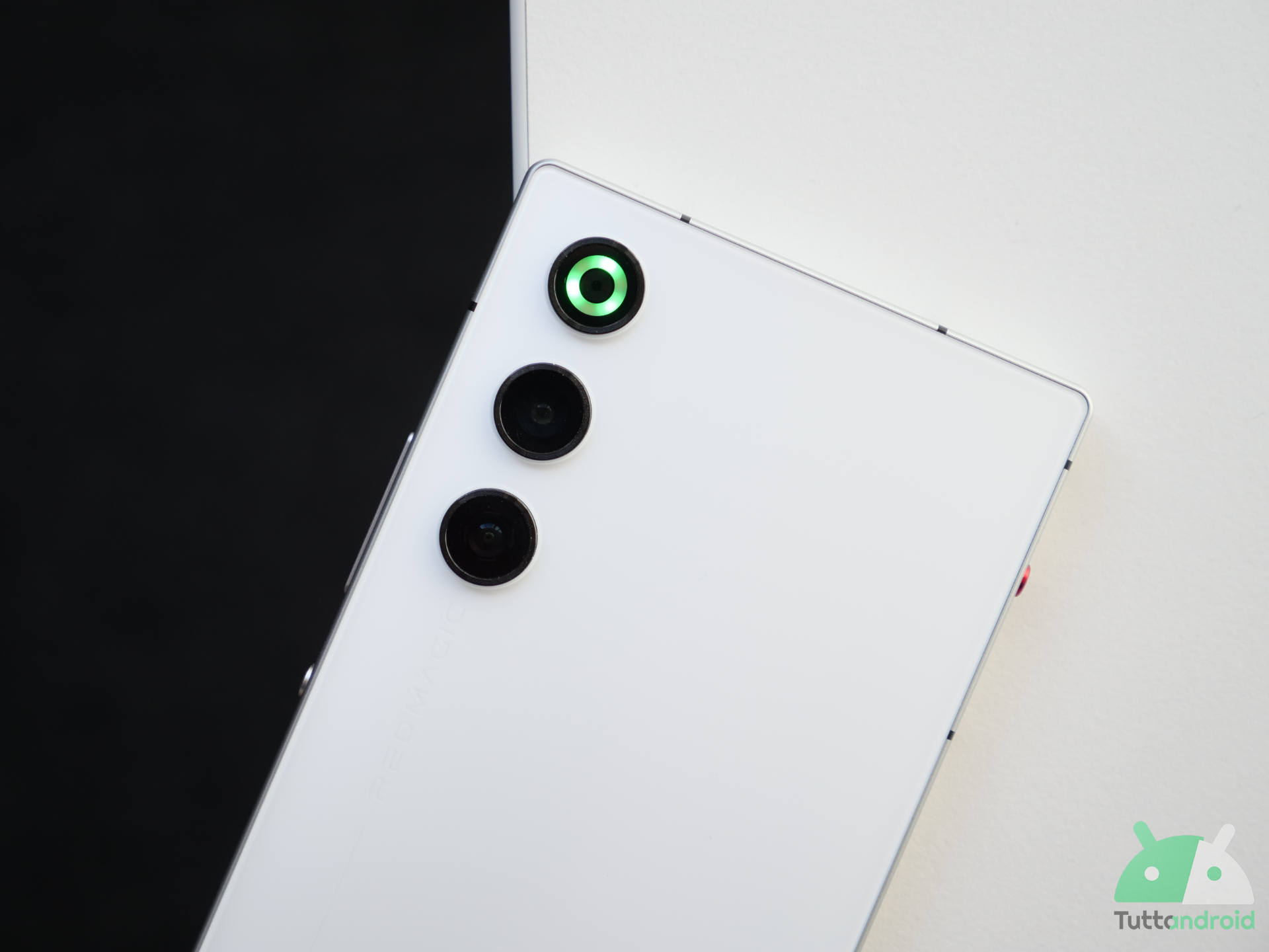 Les soins constructifs sont excellents: cadre en aluminium robuste, assemblage précis et sensation générale de solidité, nous ne sommes pas si loin par exemple d’un Samsung Galaxy S25 Ultra, même en considérant les formes carrées. À l’arrière, nous ne trouvons que deux éléments circulaires saillants pour le Chambers et un anneau LED RVB au-dessus d’eux qui illumine discrètement pour les notifications ou pendant les jeux, une touche de personnalité sans excès. Rien Les grilles de ventilation et le ventilateur interne, gagnant dans le nettoyage et la certification esthétiques IP54 (résistance à la poussière et croquis d’eau).