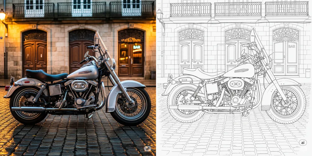 - Invite 1: une image photojournaliste d’une moto vintage garée sur une route de la ville;