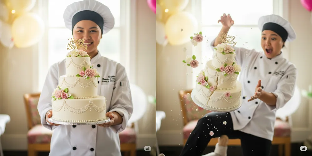 - Invite 1: génère l’image d’une personne debout tenant un gâteau à trois étages à la main;